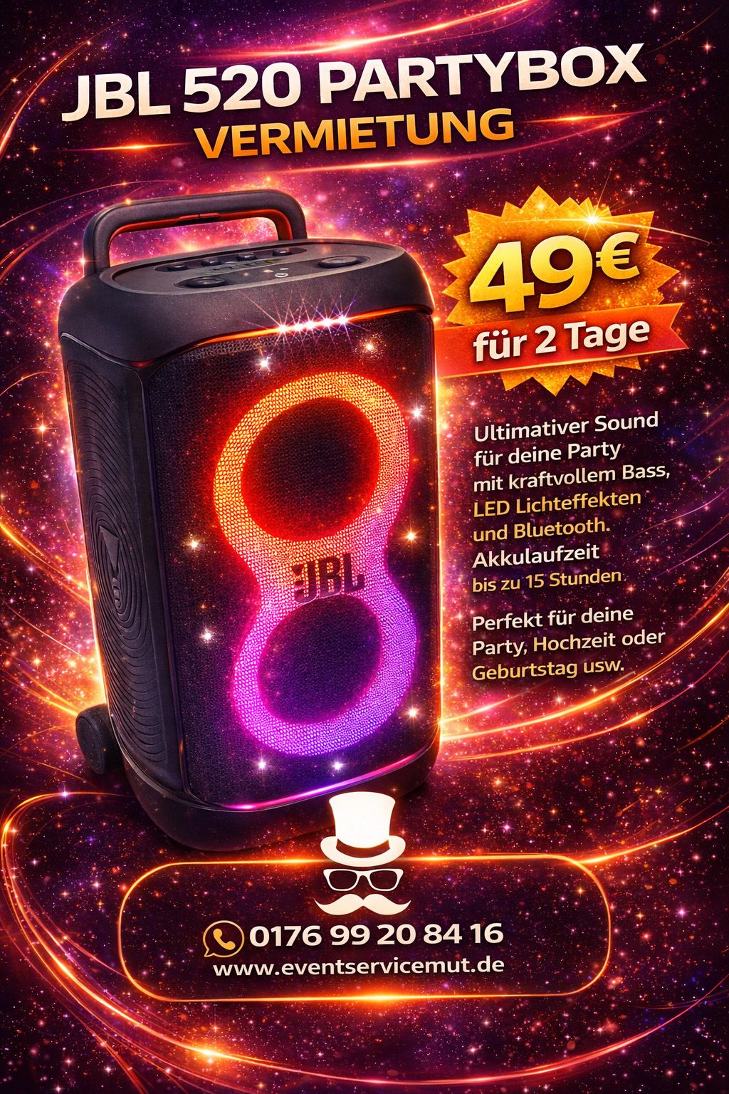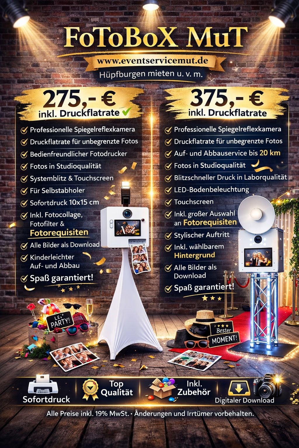 Unser Sortiment wird immer größer. Wir bieten Hüpfburgen, Fotoboxen, eine Popcornmaschine, Anhänger, ein Audio-Gästebuch-Telefon, die JBL 520 PartyBox, Stand-Up-Paddles,Stehtische und bald noch vieles mehr an.
